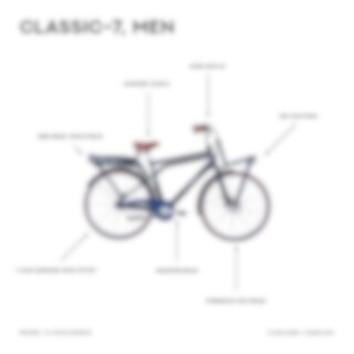 Designmessig er CLASSIC-7 en fulltreffer med lekre farger og lærdetaljer på håndtak samt brune dekk. Bagasjeholder finnes både foran og bak. Detaljer som skjermer, kjedebeskytter og bagasjeholder er lakkert i samme farge som sykkelens ramme, noe som gir et luksuriøst og retro inntrykk.