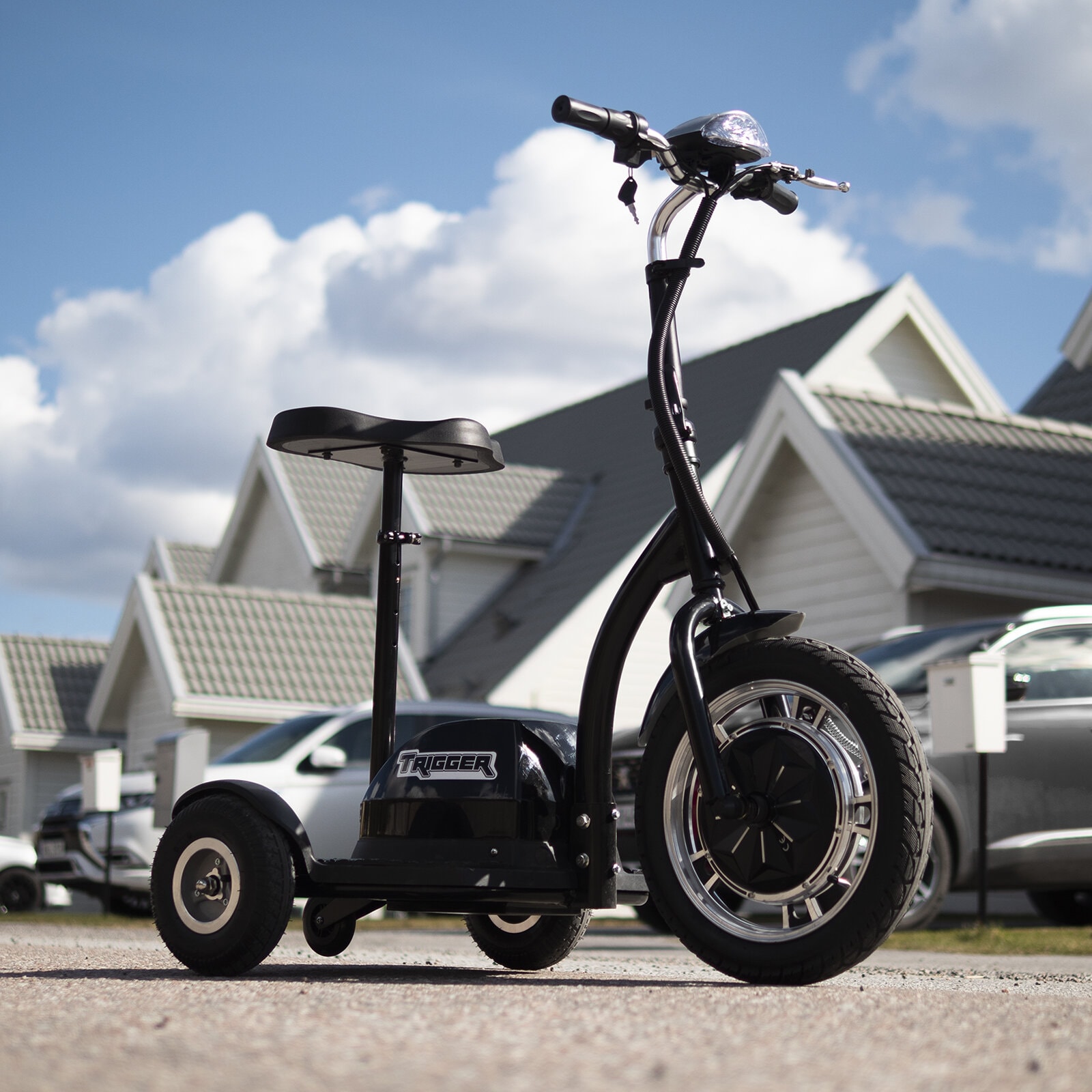 Trigger er like morsom å kjøre som hobbykjøretøy som den er praktisk for transport og som hjelpemiddel. Scooteren kan kjøres stående eller med det medfølgende setet. Styret og setet kan justeres i høyden, og scooteren har hurtigkobling for setepinnen og en praktisk sammenleggingsfunksjon for styret.