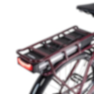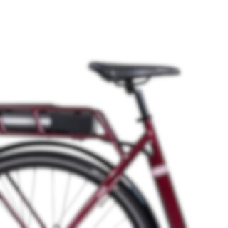 Sykkelens litiumbatteri er plassert i bagasjeholderen. Det går helt fint å lade batteriet montert på sykkelen, men alternativt kan det tas av for lading på et annet sted.