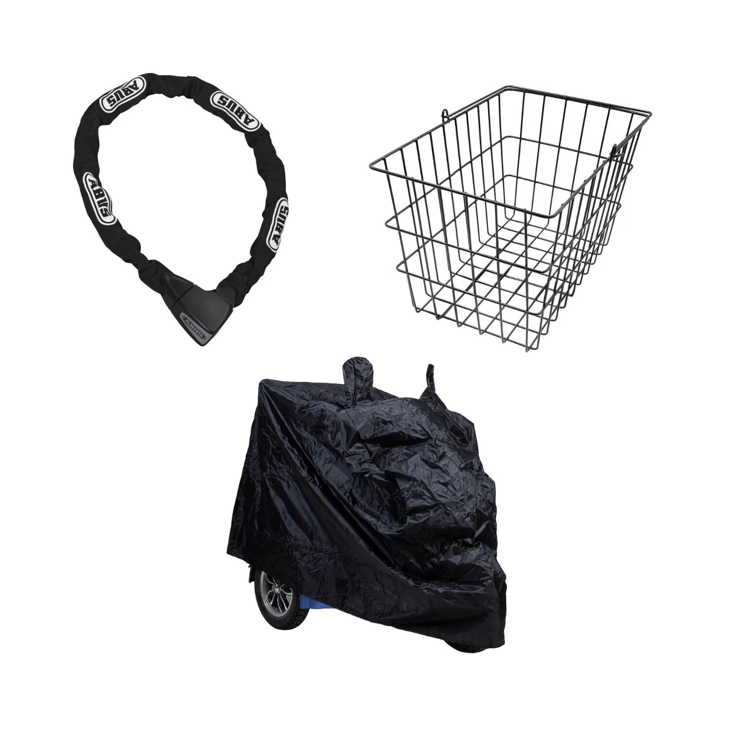 Pakke med tilbehør til Blimo Moto og Blimo Moto Sport. Inkluderer beskyttelsestrekk, bakkurv og kjettinglås.